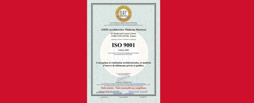 L’Organisme Français de Certification (http://www.ofcertification.fr/) audite et confirme la certification ISO 9001 Edition 2008 pour la maîtrise de son Système de Management de la Qualité dans les domaines d’activité :Conception et réalisation architecturales, et maîtrise d’oeuvre de bâtiments privés et publics.